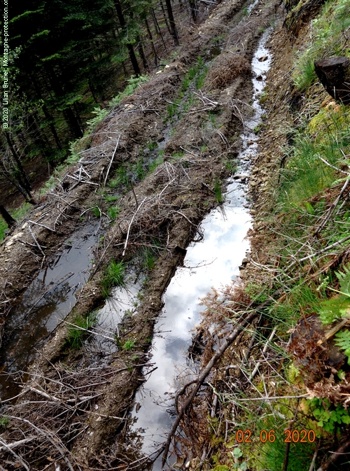 même des sols tassés dont le rôle d'éponge est ainsi amoindri.Sans oublier les 23 plates-formes nouvelles où l'eau bien souvent soit stagne, soit s'écoule tout en ravinant les pistes elles-mêmes.Voici donc quelques photos illustrant ces écoulements d'eau que d'aucuns pourraient qualifier d'artificiels.